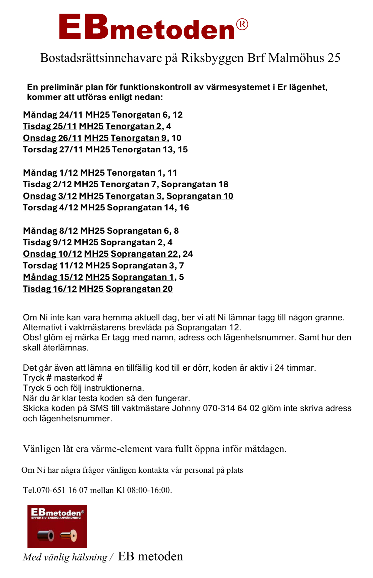Det är dax att underhålla värmesystemet. De måste få tillgång till alla lägenheter. Nedan ser ni en preliminär plan och ni får en avisering i er brevlåda en vecka innan. Räkna med att detta tar några timmar.