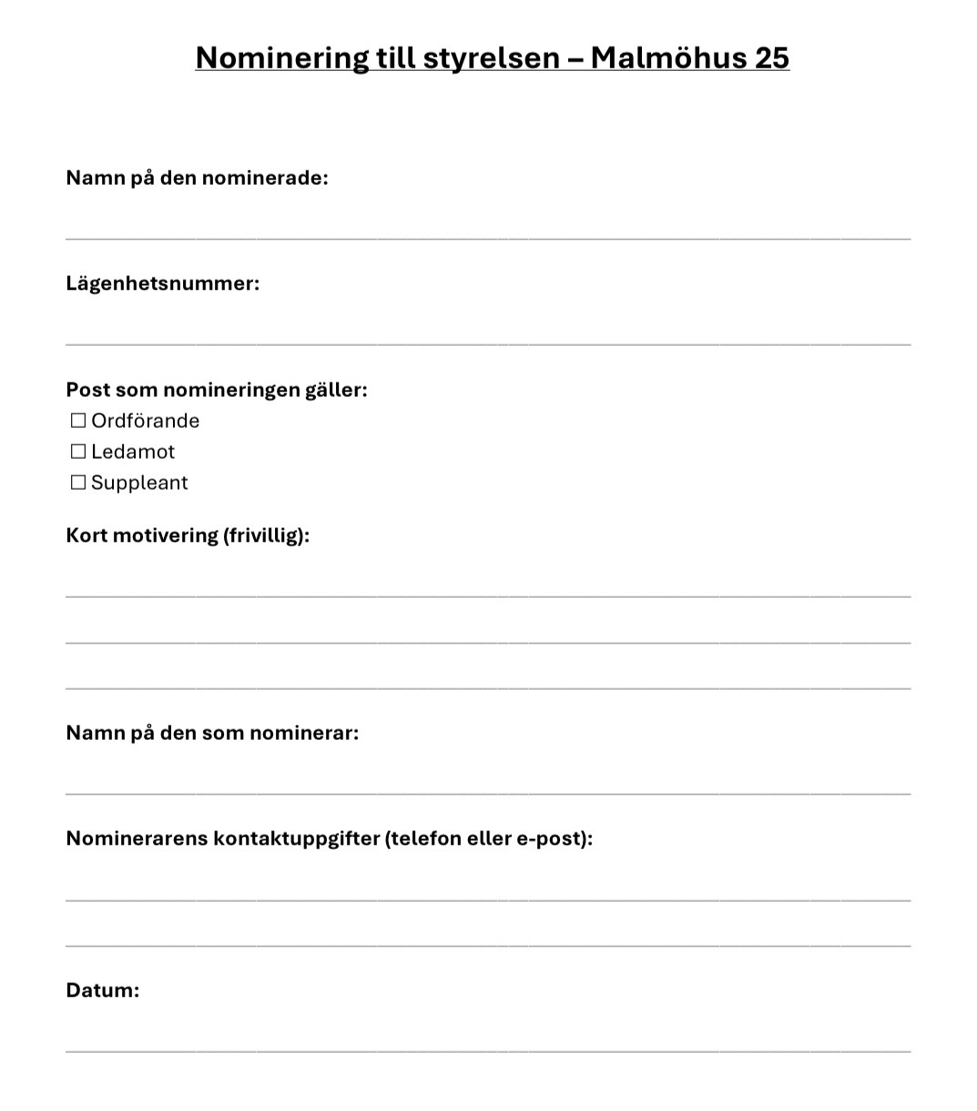 Det går även bra att lägga en skriftlig nominering i min dörr, Soprangatan 8, plan 2 lägenhetsnummer 1102.